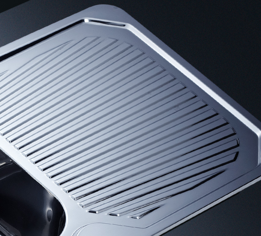 阿發(fā)水槽立邊采用國際先進的10-25°小R角一次成型拉伸技術(shù),更具立體感與時尚潮流,亦能充分擴展水槽利用空間;一次成型拉伸技術(shù),杜絕了焊接工藝易產(chǎn)生的水槽生銹,脫焊事故,充分保障水槽50年以上的使用壽命