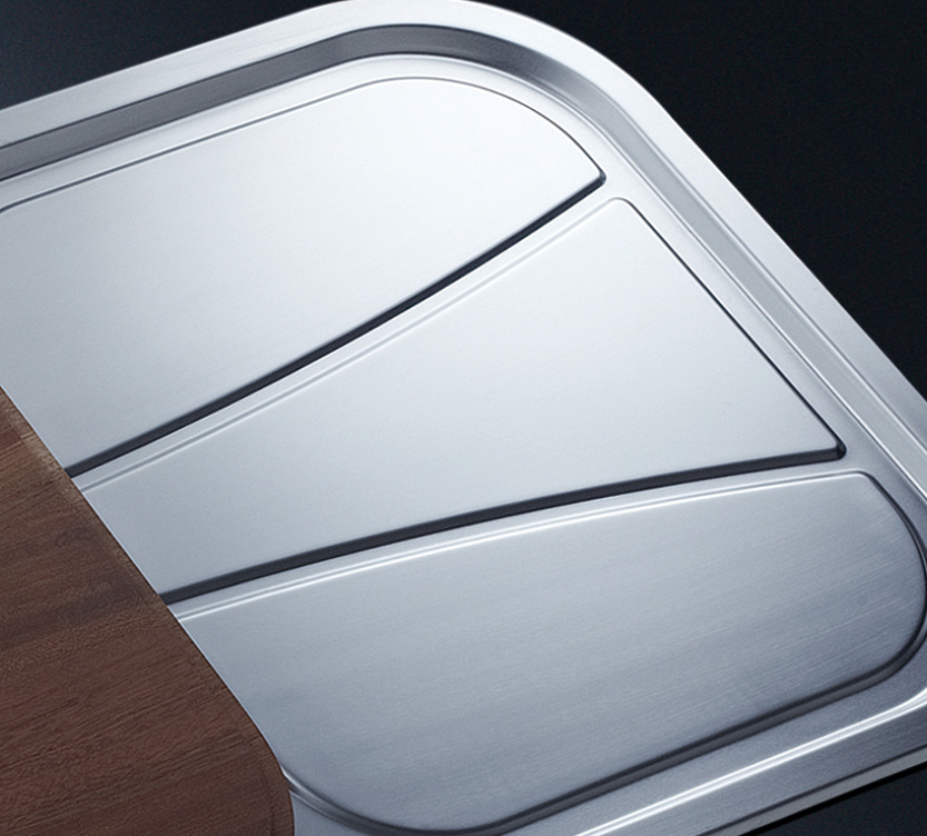 阿發水槽整體經拉絲處理,質地更加光滑,視覺更加柔和。能有效抵擋異物撞擊,刮傷及磨損,防止油污沾染,常用常新;柔和的光澤令水槽平添高雅氣質,更能避免鏡面材質反射的光污染