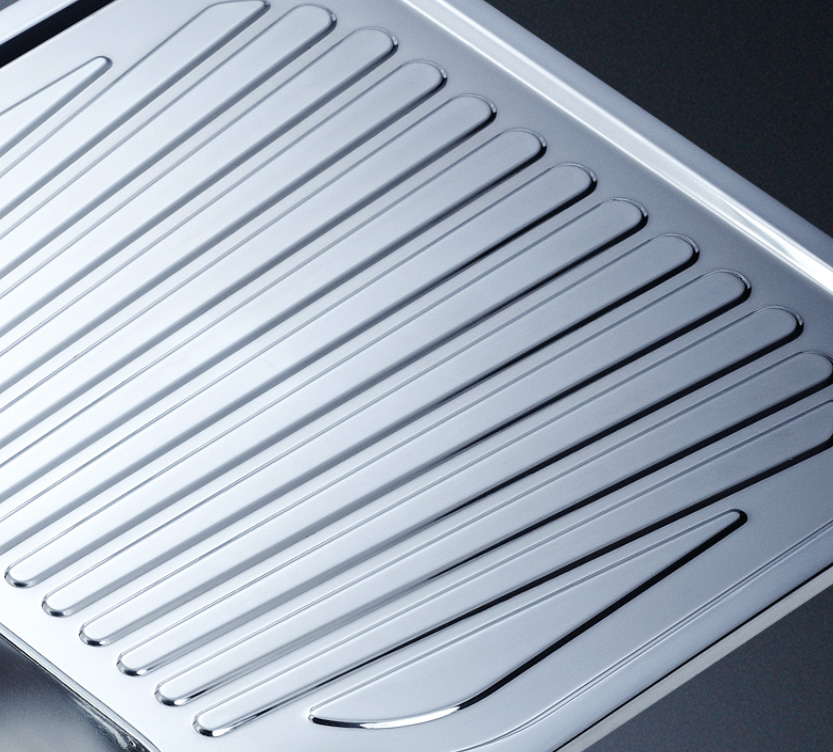 阿發水槽立邊采用國際先進的10-25°小R角一次成型拉伸技術,更具立體感與時尚潮流,亦能充分擴展水槽利用空間;一次成型拉伸技術,杜絕了焊接工藝易產生的水槽生銹,脫焊事故,充分保障水槽50年以上的使用壽命