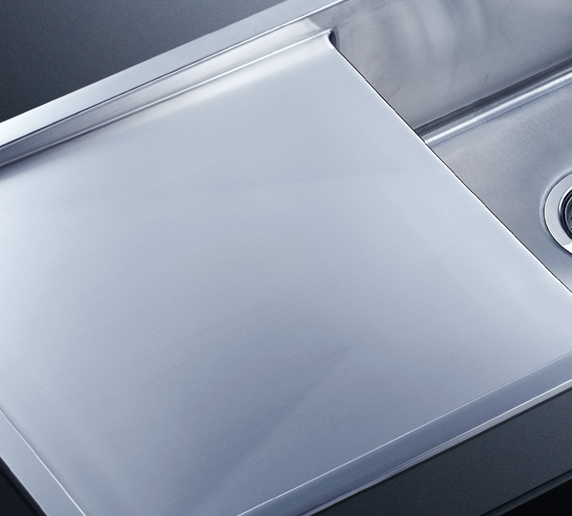 阿發水槽整體經拉絲處理,質地更加光滑,視覺更加柔和。能有效抵擋異物撞擊,刮傷及磨損,防止油污沾染,常用常新;柔和的光澤令水槽平添高雅氣質,更能避免鏡面材質反射的光污染