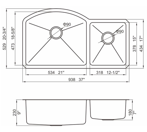 槽底采用斜面壓痕,四輻導流槽設計,與平面壓痕和無痕水槽相比,導水更為流暢,下水更迅速,能有效防止積水,消除沉淀物
