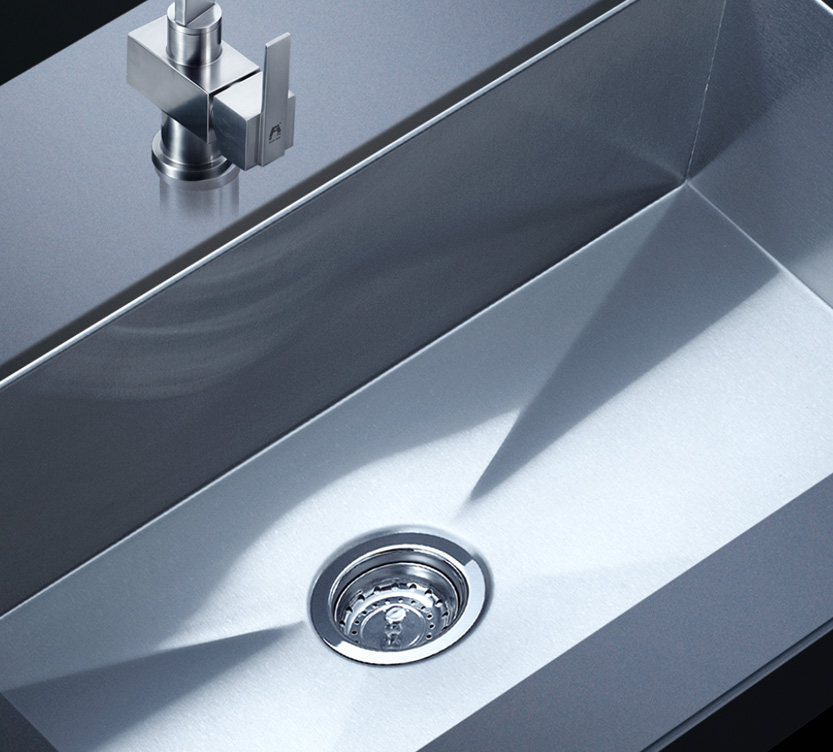 阿發水槽整體經拉絲處理,質地更加光滑,視覺更加柔和。能有效抵擋異物撞擊,刮傷及磨損,防止油污沾染,常用常新;柔和的光澤令水槽平添高雅氣質,更能避免鏡面材質反射的光污染